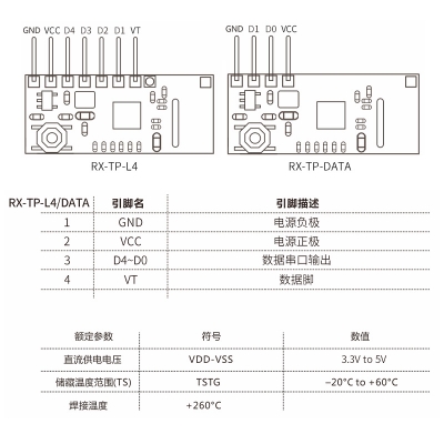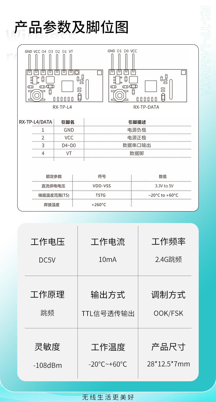 RX-TP-L4/DATA是一款低功耗2.4G双向反馈跳频接收模块,抗干扰性强,不受同频干扰。主要91短视频下载色版APP于91短视频版在线观看免费接收领域,与其他的接收模块比较,具有价格便宜、性能好、稳定等特点。
