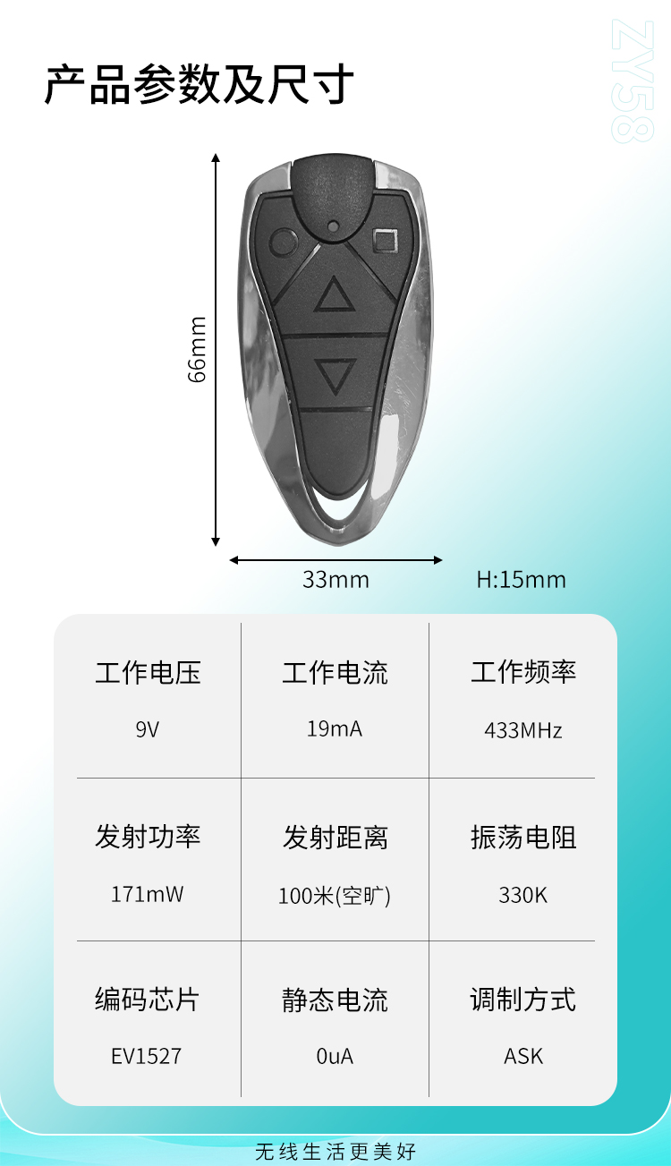 ZY58-5是一款具有5个触发按键的91短视频版在线观看免费遥控器,可以跟本公司的接收模块与控制器配套使用;也可以单独为客户91短视频下载色版APP,ZY58-591短视频版在线观看免费遥控器,具有可靠性高、频率稳定、穿透能力强等特点;